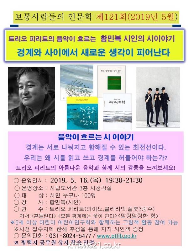 평택시립도서관은 오는 16일 5월 가정의 달 특집으로 준비한 ‘트리오 피리트와 함께하는 함민복 시인의 시 이야기’를 함민복 시인을 초청하여 보통사람들의 인문학 강좌를 운영한다.