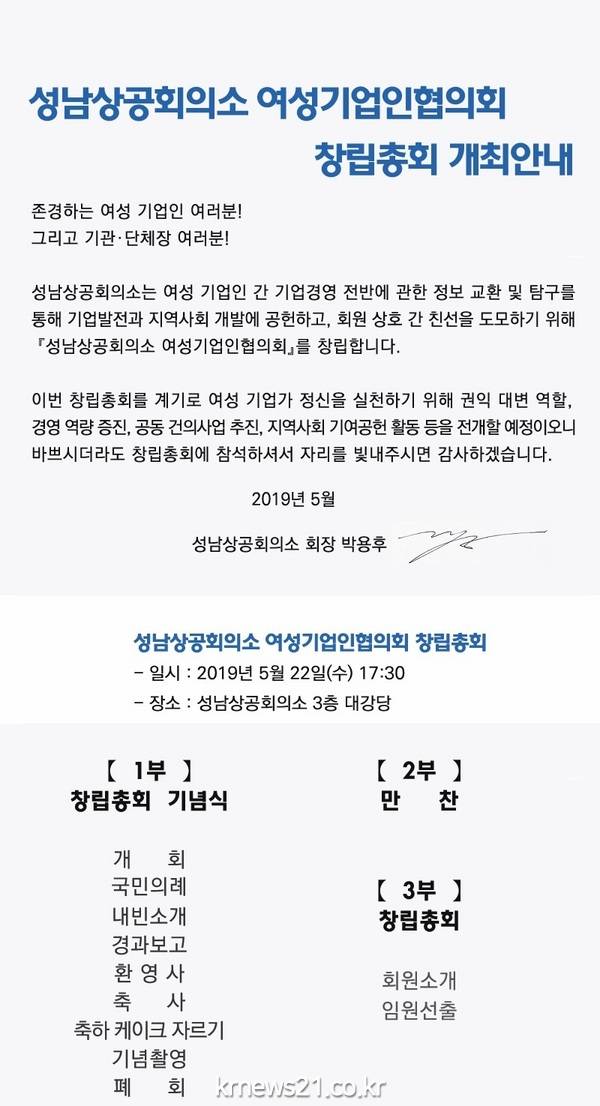 한편, 성남상공회의소 여성 기업인협의회는 오는 5월 22일(수) 17시 30분 성남상공회의소 대강당에서 성남상공회의소 여성 기업인협의회 창립총회를 개최할 예정이고, 성남지역 소재 여성 기업체의 임원 이상은 누구나 참여할 수 있으며 회원가입 신청 문의는 성남상공회의소 홈페이지(공지사항) 또는 대외협력부(Tel.031-781-7904)로 하면 된다.