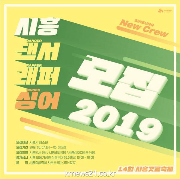 시흥시(시장 임병택)는 2019 문화관광축제 우수축제로 선정된 제14회 시흥 갯골 축제(9.20.~9.22.)의 사전 프로그램 중 하나인 ‘2019 시흥 댄서 래퍼 싱어’의 주인공이 될, 끼 많고 흥 넘치는 청소년들을 모집한다.