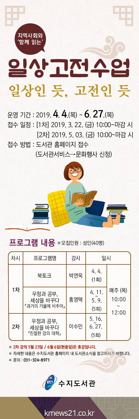 수지도서관은 5월 16일~6월 27일 매주 목요일 오전 10시부터 2시간 동안 고전을 읽으며 소통하는 독서프로그램 일상고전수업을 진행한다.