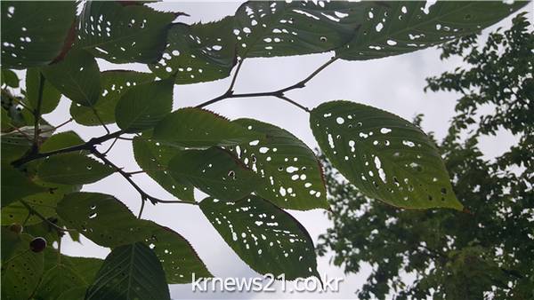 ▲ [사진=식물병 벚나무 잎]잎에 구멍이 생기며 일찍 떨어지는 벚나무의 식물병을 자생 미생물을 이용하여 친환경적으로 억제하는 천연식물보호제가 선보인다.