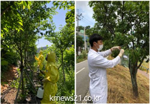 ▲ [사진=약 주사 중인 연구진]연구진은 국내 토양에서 분리한 1,000여 주의 균주에 대한 벚나무류 식물병 발병억제 효능을 탐색한 결과, '바실러스 메틸로트로피쿠스 8-2 균주'를 발굴하고 2017년 12월에 특허를 출원했다.