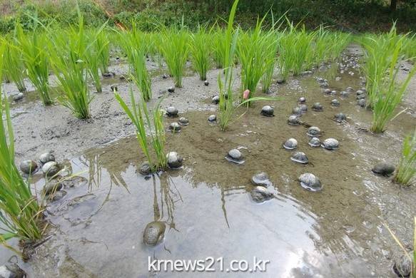 농기센터 관계자는 “수면과 수면 아래 있는 연한 풀을 먹는 우렁이 먹이습성 상 논의 정지작업을 균일하게 하여 모가 잠기지 않아야 모 피해가 없고 제초효과를 높일 수 있다.”고 말했다.