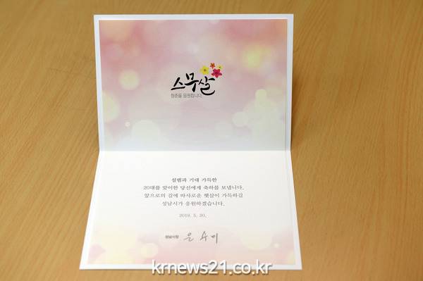 축하 카드에 “설렘과 기대 가득한 20대를 맞이한 당신에게 축하를 보냅니다. 앞으로의 길에 따사로운 햇살이 가득하길 성남시가 응원하겠습니다”라고 적었다.