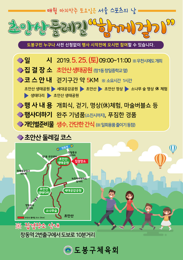 도봉구(구청장 이동진)가 ‘서울 스포츠 날’의 일환으로 오는 5월 25일 오전 9시부터 도봉체육회 주관으로 ‘초안산 둘레길 함께 걷기’ 행사를 진행한다.
