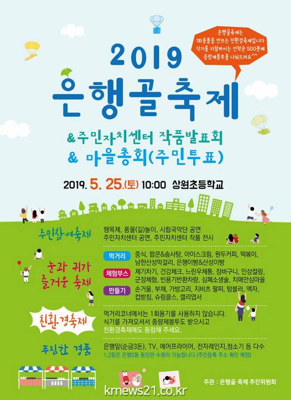 성남시(시장 은수미) 중원구 은행2동은 오는 5월 25일 상원초등학교 운동장에서 ‘2019년 은행골 축제’를 연다.