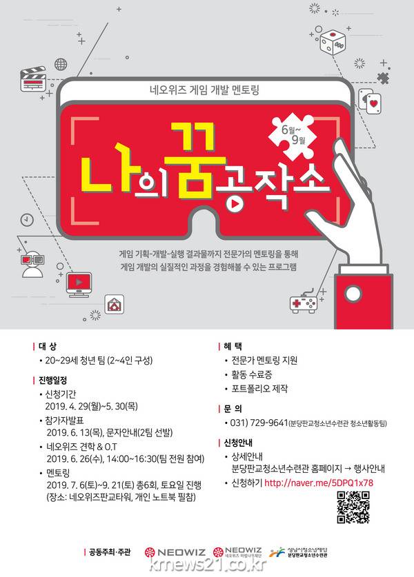 성남시 청소년재단 분당 판교 청소년수련관(관장 김진명)은 게임 IT 전문기업 ㈜네오위즈(대표 문지수), 네오위즈 마법 나무재단(이사장 나성균)과 공동 운영하는 게임 개발 멘토링‘나의 꿈 공작소’의 참가팀을 모집하고 있다.