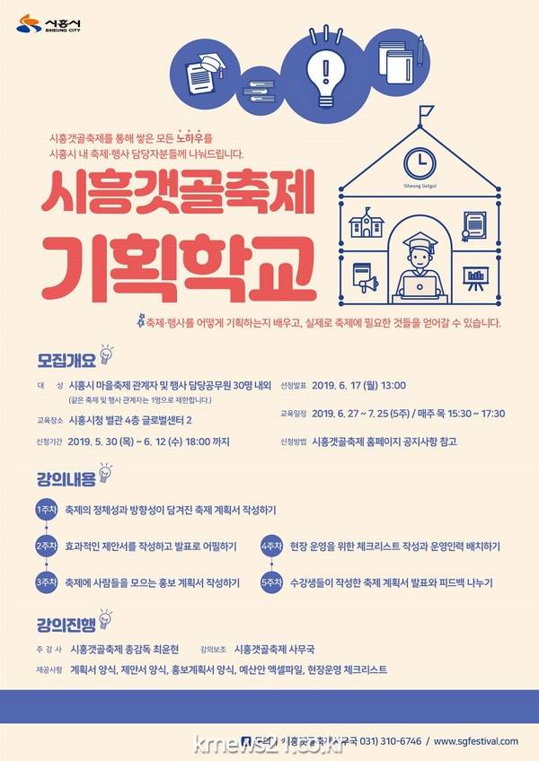 수강생으로는 시흥시 마을 축제 관계자 및 행사 담당 공무원 30명 내외의 인원을 선발할 예정이다. 시흥 갯골축제 기획학교의 접수 방법 및 자세한 내용은 제14회 시흥 갯골축제 홈페이지(www.sgfestival.com)에서 확인할 수 있다.
