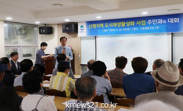 평택시는 지난 23일 ‘신평지역 도시재생활성화사업’추진과 관련하여 정장선 평택시장을 비롯하여 유승영 시의원과 오세권 주민협의체 회장 등 신평동 지역주민 약 60여 명이 참석한 가운데 다양한 주민 의견 제시 등 자유로운 토론시간을 가졌다.