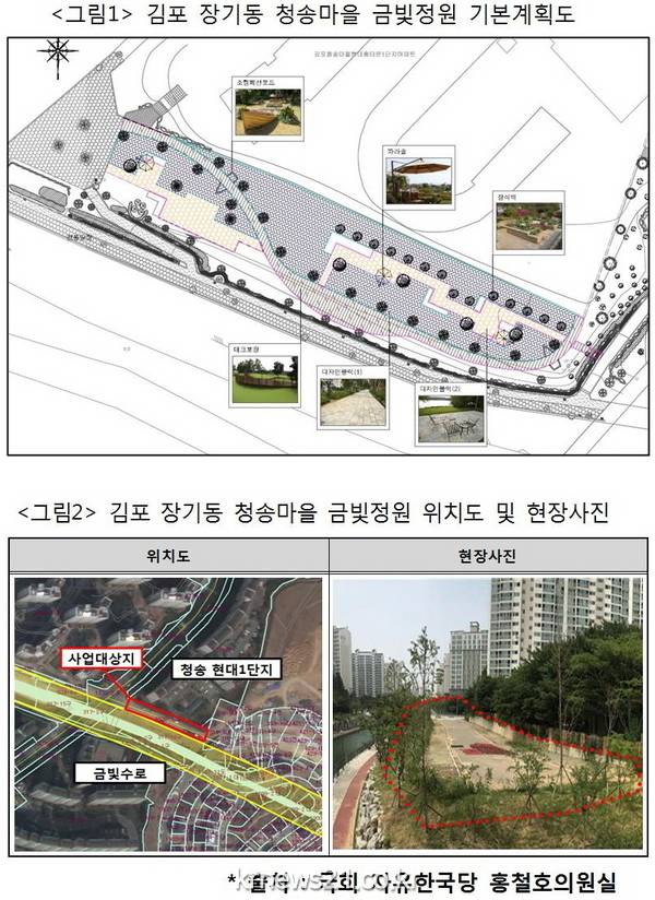 국회 자유한국당 홍철호 의원(경기 김포시을, 국토교통위원회)은 김포시 장기동 청송마을의 금빛정원(1330-1번지 일원)이 오는 31일 준공된다고 밝혔다.