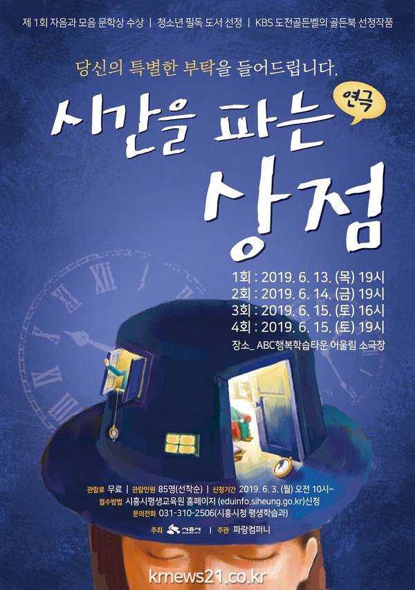 시흥시(시장 임병택)는 6월 13일부터 6월 15일까지 사흘간 총 4회에 걸쳐 시흥 ABC 행복학습타운 어울림 소극장에서 연극 <</span>시간을 파는 상점> 공연을 개최한다.