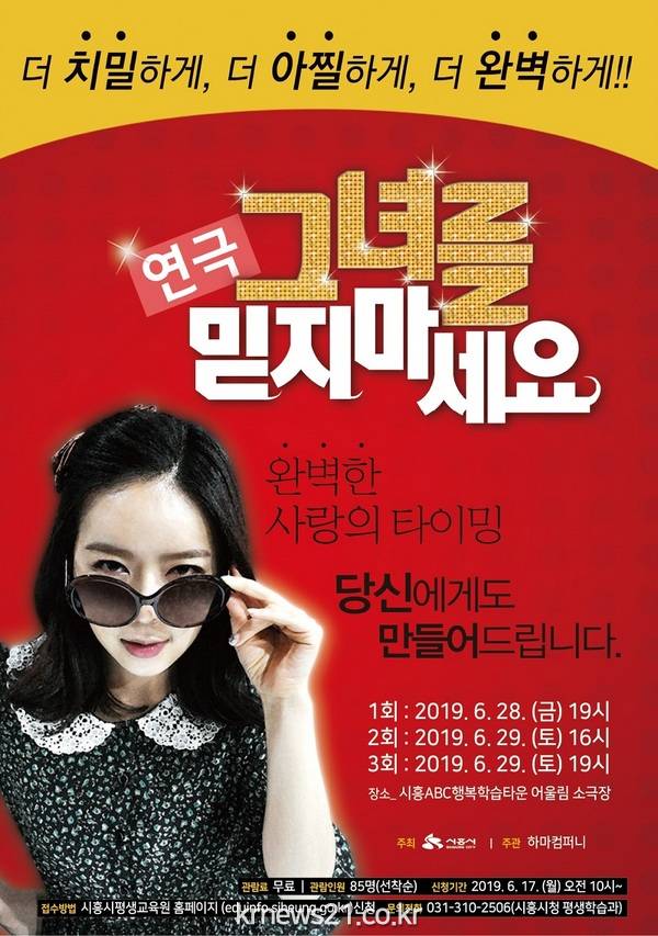 시흥시(시장 임병택)는 6월 28일부터 6월 29일까지 2일 동안 총 3회에 걸쳐 시흥 ABC 행복학습타운 어울림 소극장에서 연극 <</span>그녀를 믿지 마세요> 공연을 개최한다.