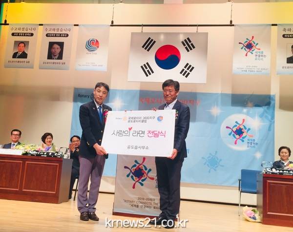 이날 공도로타리클럽은 사랑의 라면 45박스를 전달하며 이웃사랑을 실천하는 이취임식으로 진행했다.그동안 회원들은 떡·쌀기부봉사 및 어린이날 행사 자원 봉사, 환경정화 봉사활동 등 다양한 활동으로 지역사회 어려운 이웃을 위해 봉사활동을 펼쳐왔다.