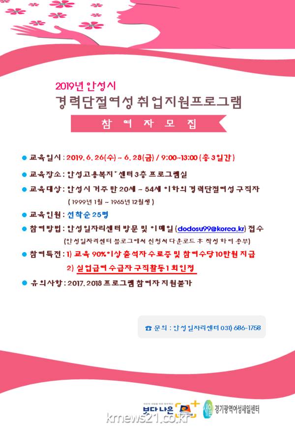 본 프로그램은 오는 26일부터 28일까지 3일간 1일 4시간씩 안성고용복지플러스센터 3층에서 진행되며, 안성시에 거주하는 1965년~1999년생의 여성구직자라면 누구나 신청 가능하다. 다만, 2017년 2018년 프로그램참여자는 지원이 제외된다.이번 프로그램은 맞춤형 취업스킬과 안성의 지역 특성을 고려한 특화된 교육내용을 바탕으로, 자존감 회복 및 취업역량 강화로 제2의 인생 설계를 통해 여성의 성공적인 재취업을 위한 교육과정으로 구성된다.또한, 교육 수료 후 안성일자리센터에서 1대1 맞춤형 직업상담, 취업정보 제공 및 사후관리를 통해 종합적인 취업지원 서비스를 제공해 실질적인 구직 및 취업 이 가능하다.김진관 창조경제과장은 재취업의 꿈을 가진 경력단절여성들이 일터로 복귀해 재능과 역량을 발휘하고 경제활동을 이어 나갈 수 있도록 지원 하겠다면서 “안성시는 앞으로도 다양한 계층 및 여성들을 위한 지속적인 일자리 발굴 등 다양한 취업지원 서비스를 마련해 나갈 것 이라고 밝혔다.참여방법은 안성일자리센터 방문 및 이메일로 신청서를 제출하면 된다. 자세한 사항은 안성일자리센터블로그(https://blog.naver.com/anseongjob)를 통해 확인하거나 또는 안성일자리센터로 (686-1758)로 문의하면 된다.