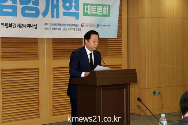 김두관 더불어민주당 참좋은지방정부위원회 상임위원장(국회의원, 경기 김포시갑)은 14일 오전 10시, 국회의원회관 제2세미나실에서 「자치분권시대의 검경개혁 대토론회」를 개최하고 “검찰과 경찰이 진정한 국민의 권력기관으로 거듭나야 한다”고 주장했다.