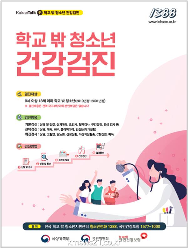특히 올해는 정기검진 3년 주기가 도래함에 따라, 2016년에 건강검진을 받은 학교 밖 청소년(9세 이상 18세 이하)은 본인비용 부담 없이 다시 건강검진을 받을 수 있다.