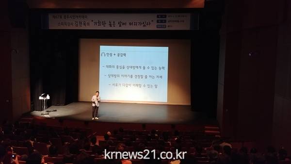 프리랜서 MC 및 스피치 강사로 활동하고 있는 김현욱 씨는 공감력, 사고력, 표현력을 바탕으로 한 소통의 기술을 통해 끊임없이 도전해 성취했던 인생의 경험을 소개하며 “기회란 놈은 앞에 머리가 있다. 뒷머리는 민머리이기 때문에 지나가면 잡을 수 없다. 꿈이 있다면 지금 당장 준비하고 도전해 목표를 이루고 꿈을 현실화하기를 바란다”며 광주시민들의 도전을 응원했다.