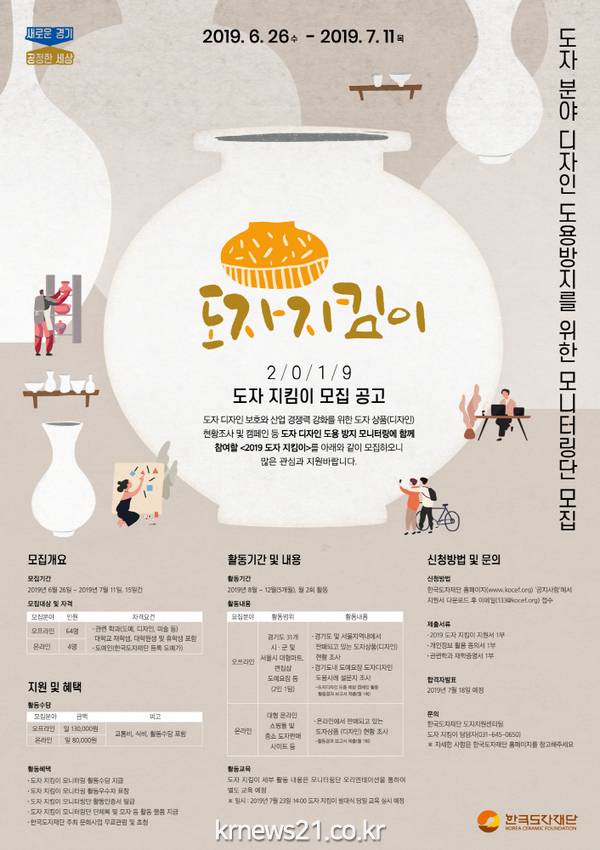 도자 지킴이는 온‧오프라인에서 디자인 도용 실태를 모니터하는 요원으로 도예·디자인·미술 등 관련학과 대학교와 대학원 재학생, 휴학생, 도자재단 등록 도예가를 대상으로 오프라인 조사 64명, 온라인 조사 4명 등 총 68명을 모집한다.