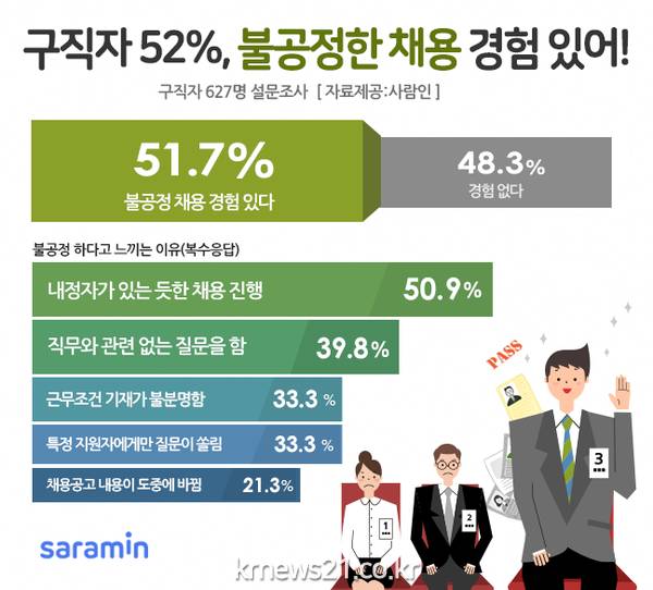 구인구직 매칭플랫폼 사람인(www.saramin.co.kr 대표 김용환)이 구직자 627명을 대상으로 ‘불공정한 채용 경험 여부’에 대해 조사한 결과, 절반을 넘는 51.7%가 ‘불공정한 채용을 경험한 적이 있다’고 답했다.