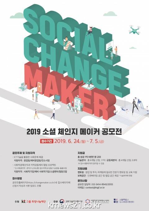 KT그룹희망나눔재단(대표 남규택, 이하 재단)은 ICT를 활용한 사회적 가치 창출을 지속적으로 추진하기 위해 과학기술정보통신부, 서울시창조경제혁신센터, 서울시도시재생지원센터와 함께 ‘2019 소셜체인지메이커 공모전’을 실시한다.
