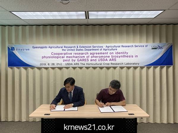 경기도농업기술원장은 지난달 28일 미국 농업연구청(USDA ARS)과 ‘곤충페로몬 생합성 기작구명 및 활용 기술개발’ 공동연구를 위한 협약식을 가졌다고 1일 밝혔다.