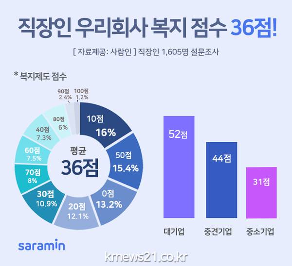 구인구직 매칭플랫폼 사람인(www.saramin.co.kr 대표 김용환)이 직장인 1,605명을 대상으로 ‘복지제도 현황과 만족도’에 대해 조사한 결과, 현재 재직중인 회사의 복지제도에 대한 점수는 평균 36점으로 집계되었다.