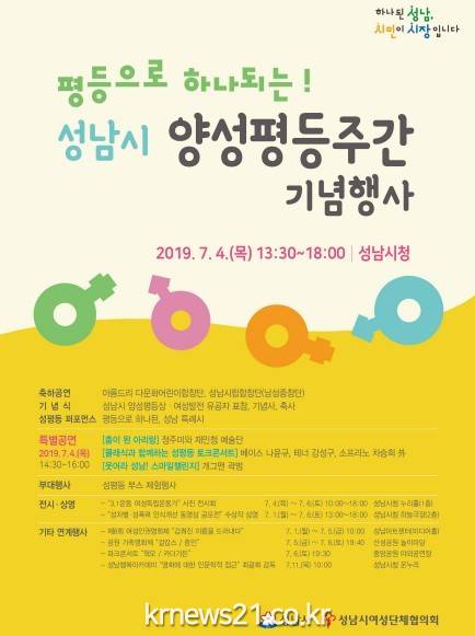 성남시(시장 은수미)는 양성평등주간(7.1~7)을 맞아 ‘평등으로 하나 되는!’을 주제로 다양한 시민 행사를 연다.