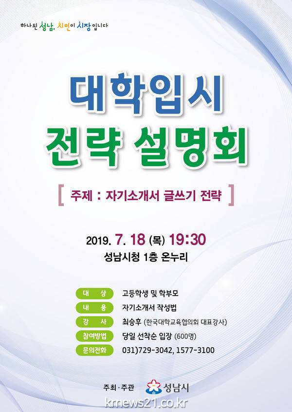 성남시(시장 은수미)는 오는 7월 18일 오후 7시 30분 시청 온누리 홀에서 입시를 앞둔 수험생과 학부모 600명을 대상으로 ‘대학입시 전략 설명회’를 연다.