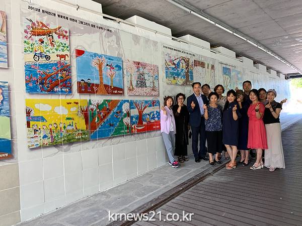 이곳엔 지난 2015년부터 2019년까지 열린 정평천 벚꽃축제 기념 어린이 그림 그리기 대회 수상작품 44점이 아트 타일로 제작돼 전시됐다.