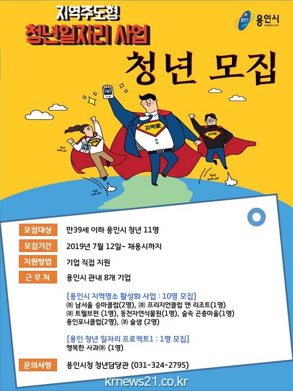 이는 행정안전부의 지역주도형 청년 일자리사업에 따른 것으로 용인 지역 명소 활성화 추진단 사업을 통해 관광기업에 10명, 용인 청년 일자리 창출 프로젝트로 사회적 경제 기업에 1명을 채용한다. 해당 기업엔 용인 청년 채용인원 1인당 매달 약 160만 원의 인건비와 직무교육비 등을 일정 기간 지원한다.