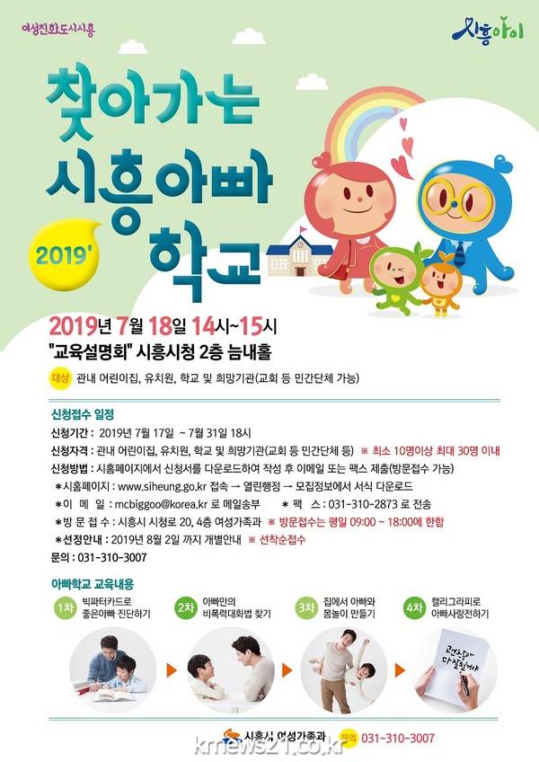 ‘찾아가는 시흥 아빠 교육’은 8월부터 진행될 예정이다. 시흥시청 여성가족과 담당자(031-310-3007)에게 문의하면 교육에 관한 자세한 설명을 들을 수 있다.