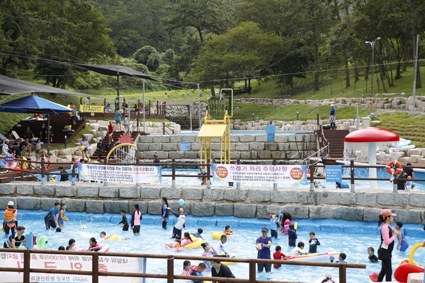 청정 계곡수로 여름 휴가철 피서지로 각광받고 있는 사천리 물놀이장이 성황리에 운영되고 있다.