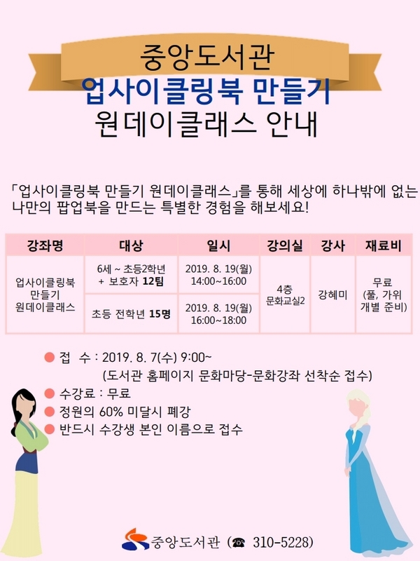 14시부터 두 시간은 6세~초등 2학년 아동과 보호자가 함께 팝업북을 만들며 추억을 쌓을 수 있도록, 16시부터 두 시간은 보호자 없이 초등 전 학년이 참여해 자기만의 개성 있는 팝업북을 만들고 서로의 작품을 감상할 수 있도록 강좌가 준비됐다.