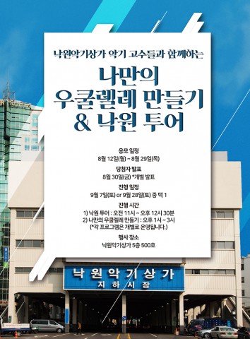 낙원악기상가의 인기 프로그램인 ‘낙원 투어’와 ‘나만의 우쿨렐레 만들기’가 서울시에서 진행하는 ‘2019년 창덕궁 앞 역사인문재생지역 주민공모사업’에 선정돼 더욱 풍성해져 돌아왔다.