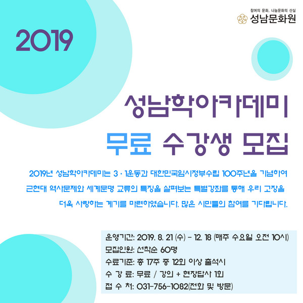 성남학 연구의 총본산인 성남문화원(원장 김대진)은, 우리 고장 성남의 역사와 문화, 전통, 사회, 인문, 교양 등을 주제로 하는 특색강좌 ‘2019 성남학 아카데미(하반기)’를 성남시민을 대상으로 8.12일부터 무료 수강생 60명을 선착순 모집한다.