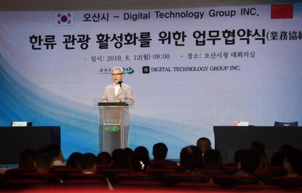 곽상욱 오산시장은 8월 12일 오산시청 대회의실에서 글로벌 금융·관광서비스 제공 전문 기업인 디지털 테크놀로지 그룹(DIGITAL TECHNOLOGY GROUP INC.) 왕루이 이사 일행과 한류 관광 활성화를 위한 협약(MOU)을 체결했다.