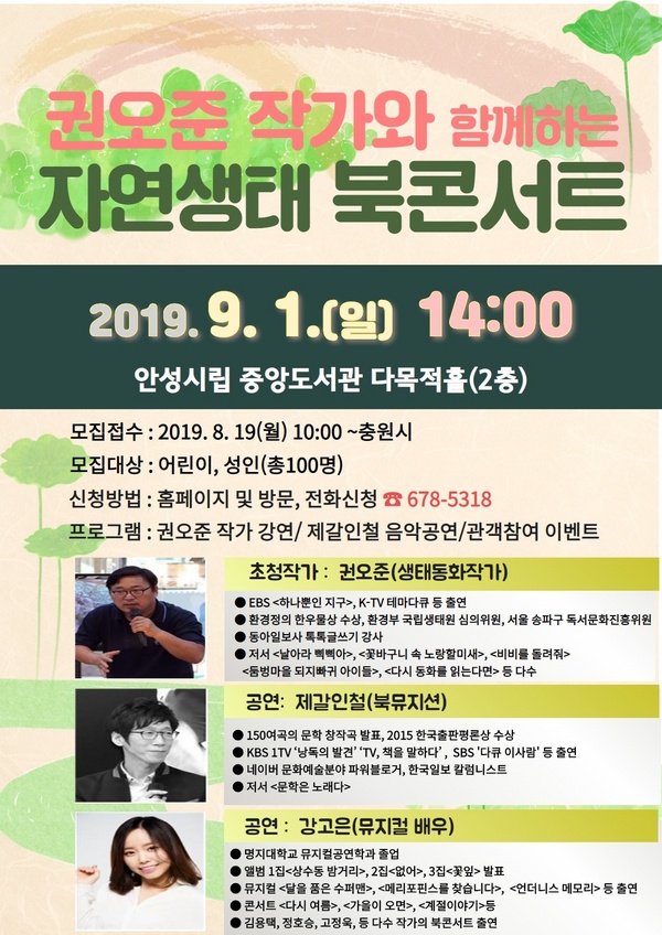 안성시립중앙도서관은 9월 독서의 달을 맞이하여 온 가족이 함께 즐길 수 있는 다채로운 독서문화행사를 마련했다. 9월 1일 오후2시 도서관 2층 다목적홀에서 권오준 작가와 함께하는 자연생태 북콘서트 공연이 펼쳐진다. 이 날 공연은 유아 및 초등학생 가족을 대상으로 자연생태 동화 작가 권오준과 북뮤지션 제갈인철, 뮤지컬 배우 강고은과 함께 작가 강연과 책노래를 들려주고 관객들이 참여하며 랩으로 즐겁게 책읽는 시간을 갖는다. 오프닝곡과 엔딩곡에서는 영화 겨울왕국 모아나 OST 공연도 펼쳐질 예정이다. 이 밖에 9월 15일은 오후1시~6시까지 온가족이 함께 즐기는 시네마 여행으로 토이스토리 몰아보기 9월 21일 오전10시~오후6시까지 도서관 2층 전시실에서 전시회로 만나는 우리 가족 독서이야기 등을 진행한다. 이와 함께 1층 로비에서는 9월 한 달 간 뒹굴뒹굴 총각이 꼰 새끼서발 원화가 전시된다. 특히 9월29일 오후2시에 도서관 2층 다목적홀에서 시(詩)를 원(願)한 노래를 주제로 귀로 읽는 詩콘서트가 열려 대중들에게 많이 알려진 시에 곡을 붙여 부르며 기타의 정갈함과 해금의 애절함이 만나 다채로운 음악을 선보이는 공연이 개최된다. 프로그램 참가방법 및 기타 자세한 사항은 안성시립도서관 홈페이지(www.anseong.go.kr/library)또는 전화(678-5318)로 문의하면 된다.
