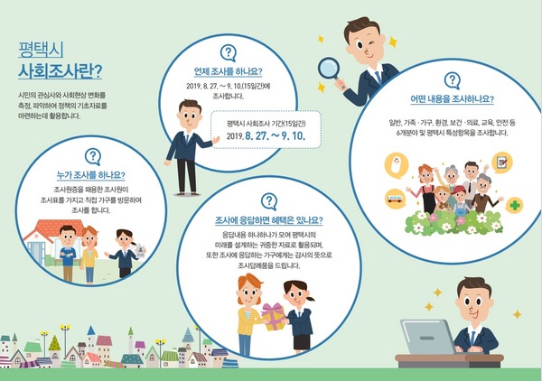 평택시(시장 정장선)는 지역개발 및 복지시책 추진을 위한 시정의 정책자료로 활용하기 위해 8월 27일부터 9월 10일까지 15일간 ‘2019년 평택시 사회조사’를 실시한다.