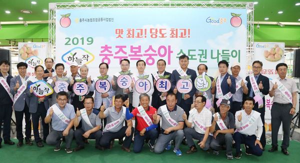 충주시는 복숭아 출하기를 맞아 지역에서 생산된 맛 좋고 품질 좋은 하늘작 충주복숭아 홍보를 위해 판촉행사에 나섰다.
