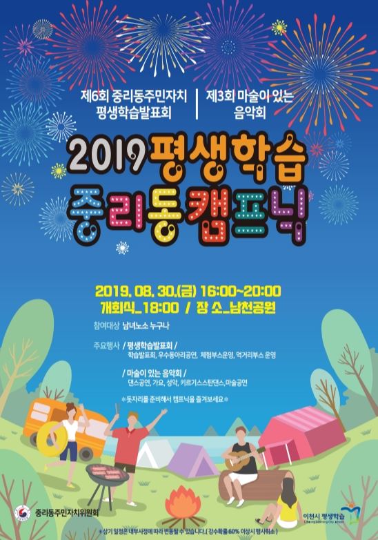 중리동주민자치위원회는 30일 제6회 중리동평생학습발표회 2019평생학습 중리동캠프닉과 제3회 마술이 있는 음악회(달빛소리 작은 음악회)를 남천공원에서 오후 4시부터 오후 8시까지 개최한다. 개막식은 오후 6시에 진행된다.