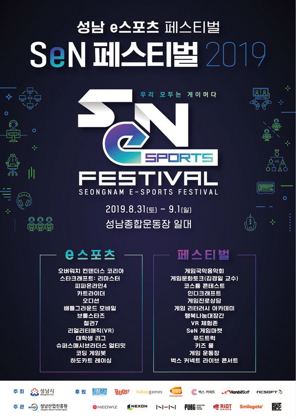 성남시가 주최하고 성남산업진흥원이 주관하는 ‘SeN 페스티벌(성남 e스포츠 페스티벌)’이 8월 31일(토)과 9월 1일(일) 양일간 성남 실내체육관, 야외보조 경기장, 다목적 체육관 등 성남시 중원구에 위치한 성남종합운동장 일대에서 진행된다.