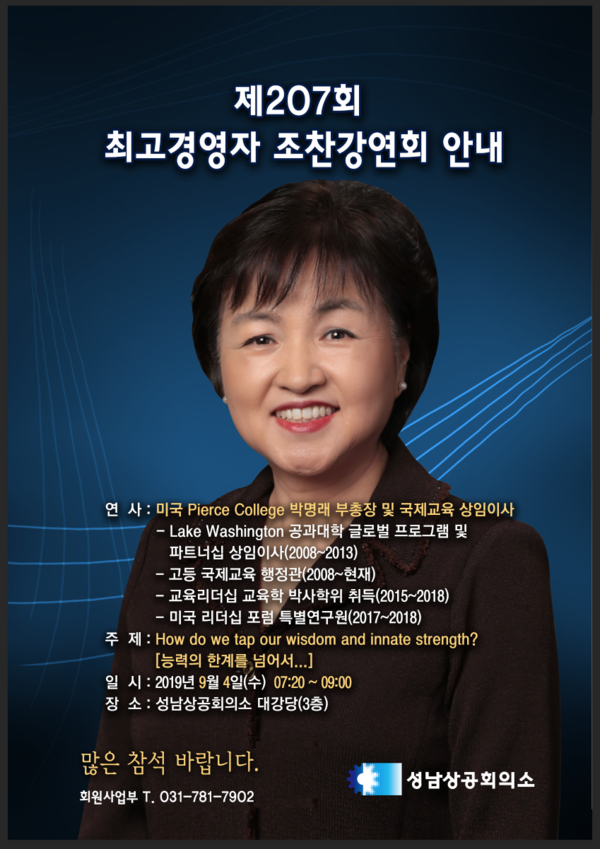이번 9월 조찬강연회는 미국 Pierce College 박명래 부총장(국제교육 상임이사)를 초청하여, “How do we tap our wisdom and innate strength? [능력의 한계를 넘어서...]”라는 주제로 강연을 준비하였다.