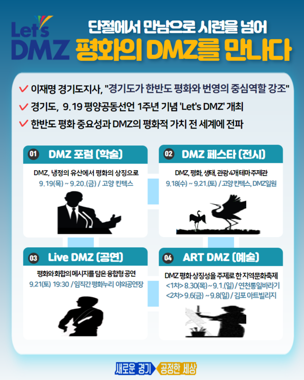 ‘9.19 평양 공동선언’ 1주년을 기념해 ‘남북평화’에 대한 경기도민의 염원을 전 세계에 알리는 ‘Let’s DMZ’ 행사가 9월 한 달 동안 고양, 연천, 김포 등 경기 북부 일원에서 펼쳐진다.