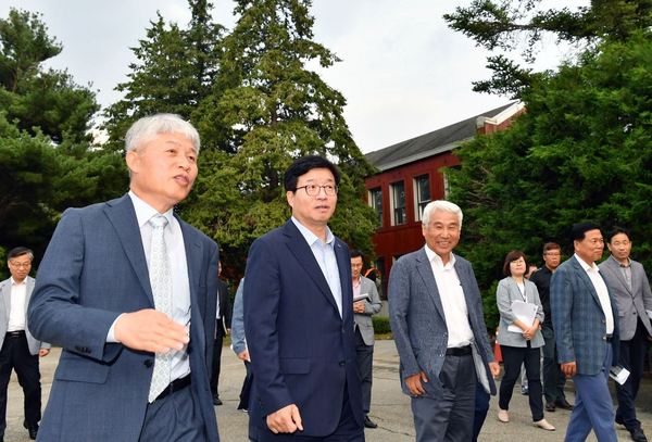 염태영 시장(왼쪽 2번째)과 이석하 학장(왼쪽 1번째)이 구 서울대학교 농업생명과학대를 둘러보고 있다.