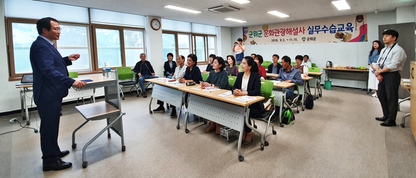 군위군(군수 김영만)은 올해 최종 선발된 11명의 신규 문화관광해설사들에게 보다 수준높은 관광해설사로 양성하기 위해 도내에서 자체교육으로는 처음으로 3일부터 11월15일까지 10주간에 걸쳐 80시간의 전문·교양·외국어 교육을 실시하고 9회에 걸쳐 관내외 견학 프로그램을 운영한다.