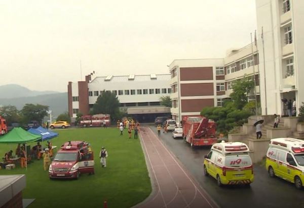 강당에서 학교장 취임식 중 원일 불명 가스 흡입으로 학생들이 두통, 어지럼증 호소하여 병원이송
