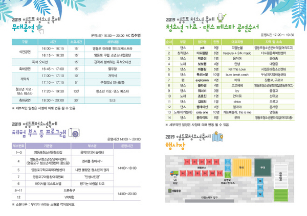 개막식에 이어 오후 5시 20분부터는 축제 하이라이트인 ‘청소년 가요·댄스 페스타’ 공연이 시작된다. 끼와 재능이 충만한 청소년 14팀이 노래, 랩, 댄스 등 공연으로 재능을 뽐내는 특별한 시간이다.