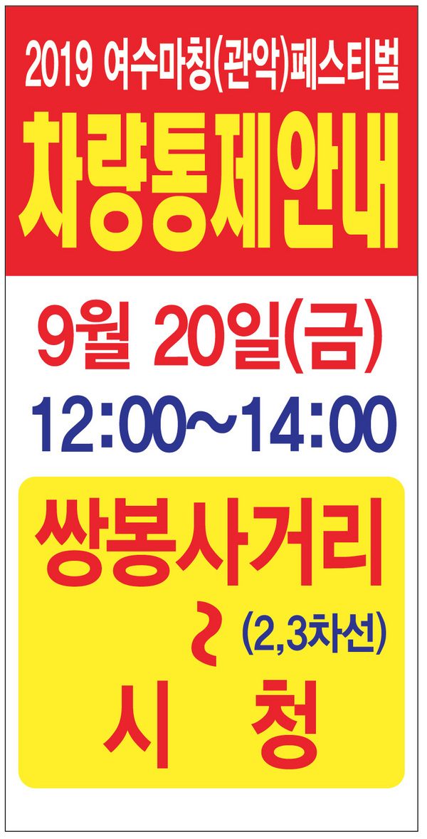 여수마칭페스티벌 거리퍼레이드로 오는 20일 낮 12시부터 오후 2시까지 여수시청~쌍봉사거리 2, 3차선이 교통통제 된다.