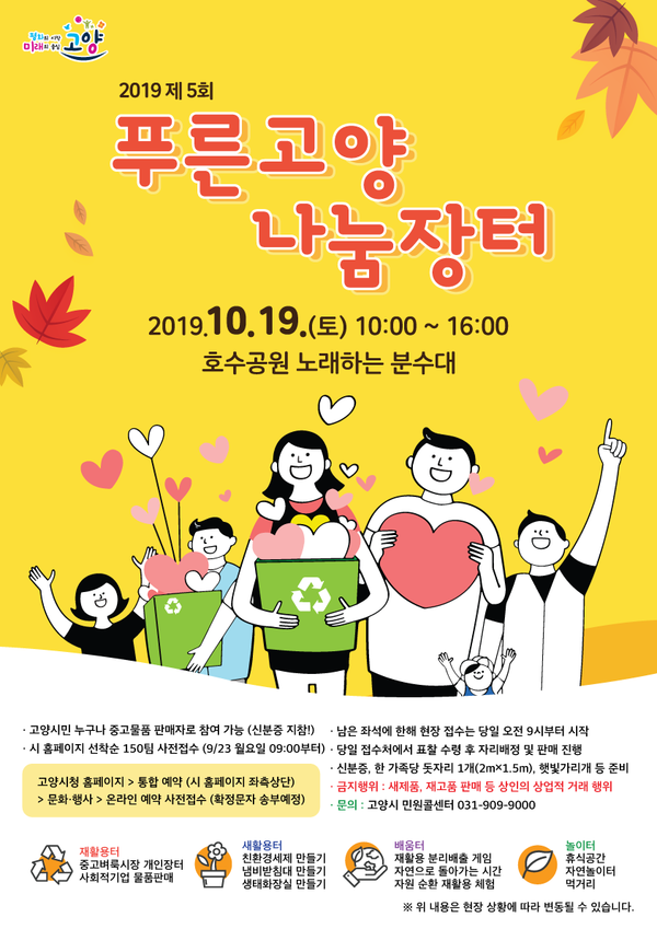 고양시 일산서구는 2019년 제5회 푸른 고양 나눔 장터를, 오는 10월 19일 오전 10시부터 오후 4시까지 노래하는 분수대에서 개최한다.