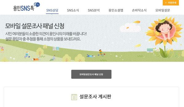 신청은 용인 SNS 톡 홈페이지(https://sotong.yongin.go.kr/front/surveyInfoService.do) 또는 가까운 주민센터에서 하면 된다. 참여 시민 중 추첨을 통해 소정의 상품도 지급한다.